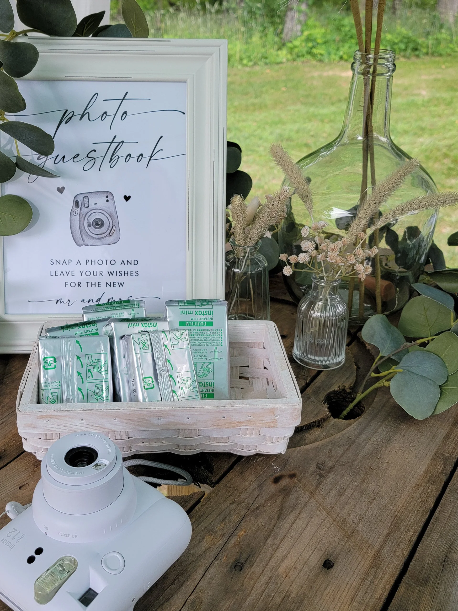 A photo booth setup with a white picture frame, small vases with dried flowers, a glass bottle with plant sticks, a basket with snack bars, and a camera on a wooden table outdoors.